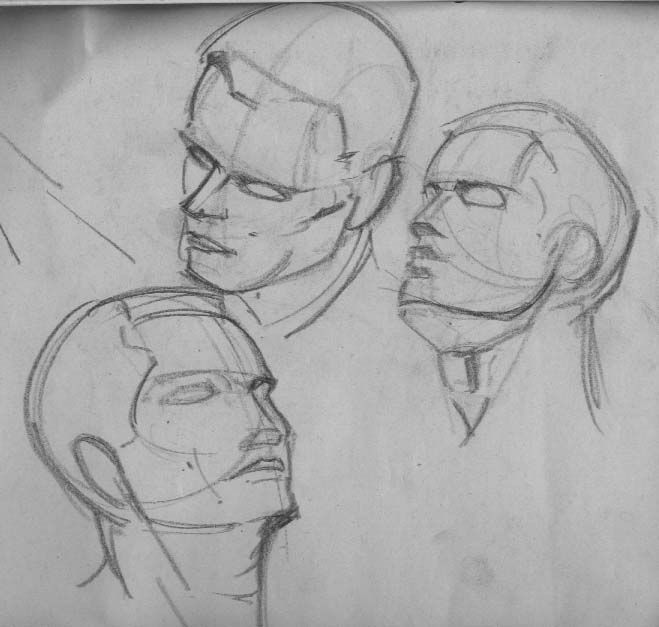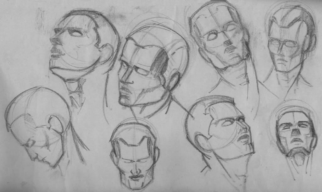 On the head sketches, they are coming along, and I like. How you play with the planes. The forma and anatomy seem a bit off on some of them, espeically around the jaw and neck line. Overall well done sir.