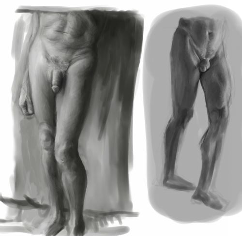 I decided I needed to work on the torso of the body, so I’ve spent some time doing studies from stock photographs. I tried not to spend too long on each one, but just get the general mass and suggestion of the few muscles I am familiar with. The color one is a copy of a medical model (I will try to dig up the website for this to share) and the faces are just because I got bored drawing chests :b