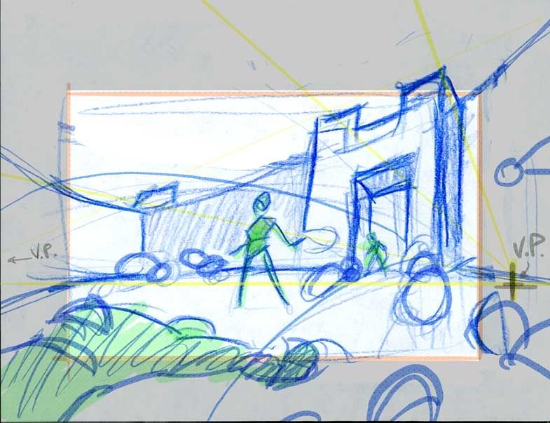 As you can see you can use your space better by merely pushing the gates to the right, the characters form a line of action that ends in the gates anyway, and just a bit further you got one of two vanishing points (the significant one, since it is closer to the action). The ants all go that way, and will enhance the effect. This all is just an idea, you can twitch it in many other ways, try different framings: you could use a more panoramic canvas or get it closer to the action, whatever works for you, but don’t let the perspective get you all jaded before you can even start to tell your tale, have fun with it and take it easy.
