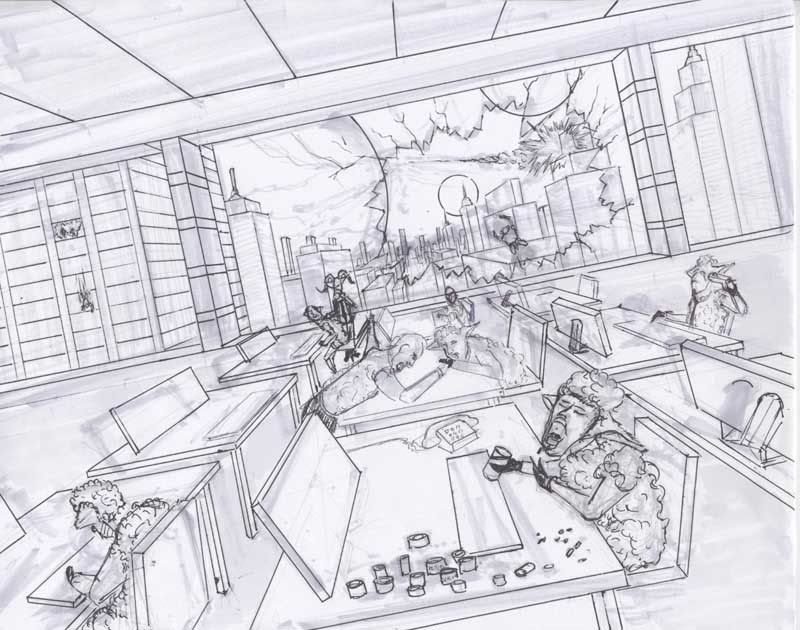 I’m thiking of a drastic change but what the hell. My initial idea was to show this cheotic environment where everybody was doing their job while the natural disaster was happening outside of the window. This idea is somewhat disatached i’m thinking of changing the point of view from third person to first person view. I’m thinking that this will have the view more involved as if this is his world this is his sittuation and the viewer is in a sittuation where he is sitting at work whille natural disasters are happening around him.