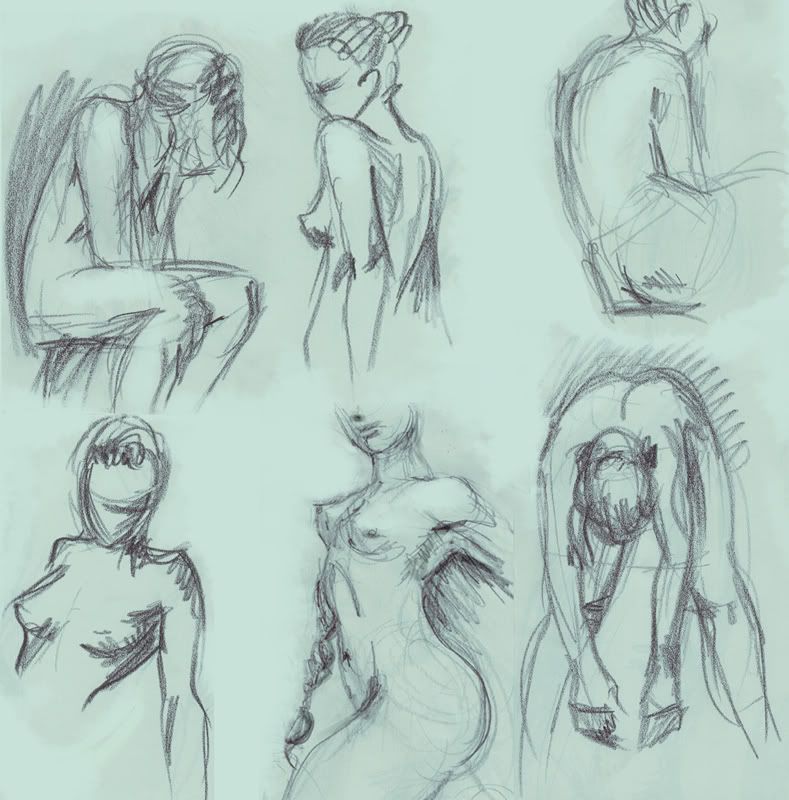 Here are some longer poses, charcoal and graphite - mostly 20 minute poses on average. I’ve brought them into photoshop and tinted them as I never seem to have enough time to work color into the original pose -