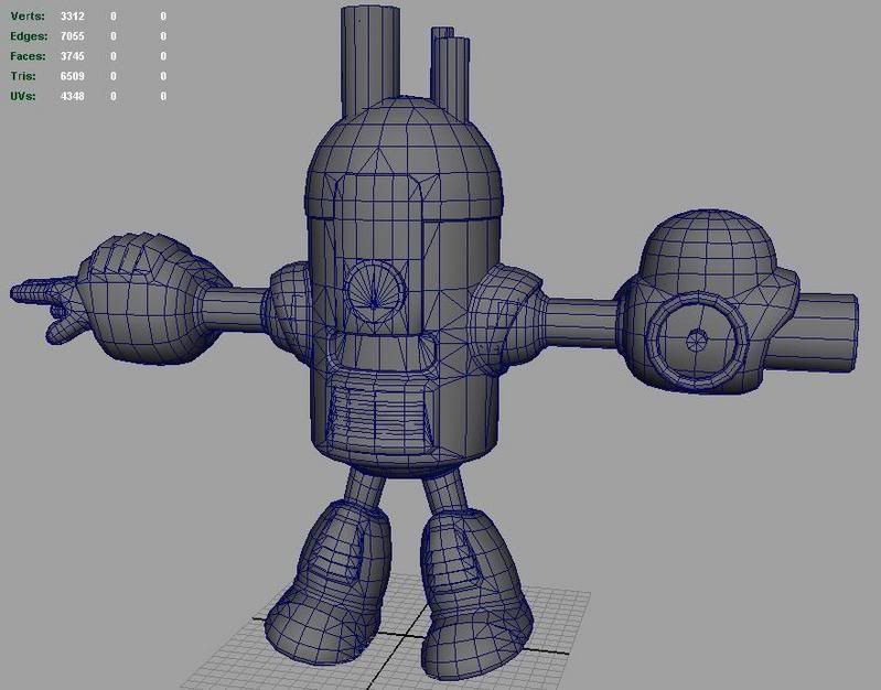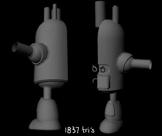 I’m finding that I’m coming in so far under budget, I could afford to smooth out those (surprisingly) jagged shoulders! I might even be able to smooth the shoulder sockets as well…but we’ll see. They’re not terribly high-priority at the moment; I still have the hand left to do, which will probably eat up a good 500-or-so tris, not to mention the furnace door on his back that I’ve been completely neglecting thus far, and I’ve got to finish attaching that lump on his arm, and make the cannon valve, and bevel the muzzle…but it’s bedtime. :shrug: