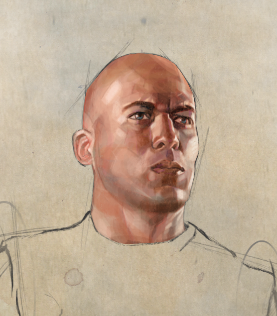 The sense of form and volume on his shirt doesn’t read very clearly. The overall form reads more like a boxy shape than a torso shape, due to the values being a bit flat on average and not conforming to the figure as much as it should (for the sake of better clarity in readability). The lower/left area is particularly problematic because it is so overexposed and have no more information left to discern form and volume.